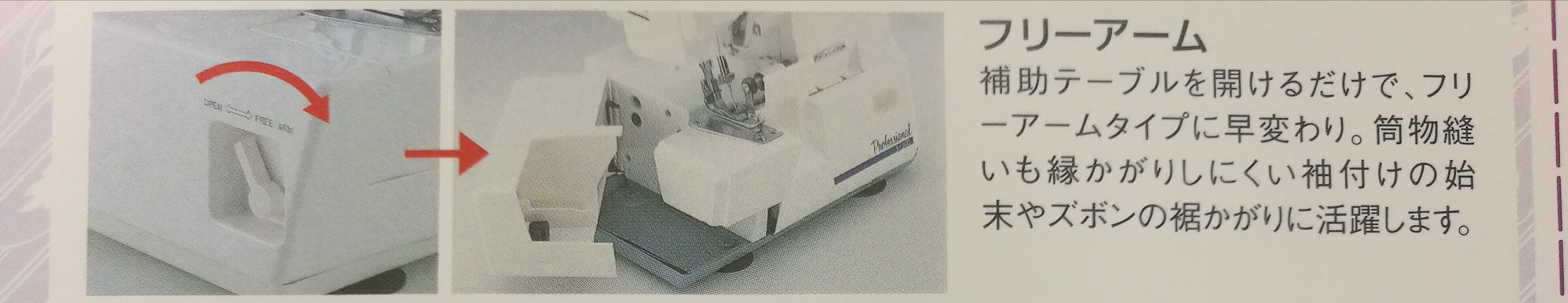 補助テーブルを開けるだけで、フリーアームタイプに早変わり。筒物縫いも縁かがりしにくい袖付の始末やズボンの裾かがりに活躍します。