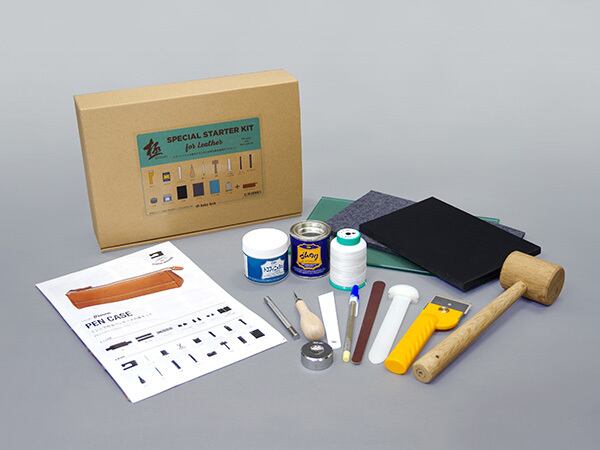 ※ レザークラフトにまず必要な15種類の用具と、初心者でも簡単につくれる「本革のペンケースキット」をセットにした、これからミシンレザークラフトをはじめる方にぴったりのキットです。